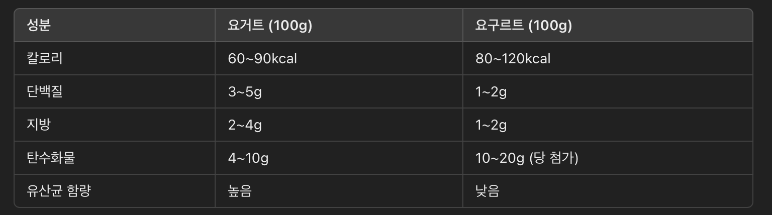 👉 요거트가 단백질과 유산균이 더 풍부하고, 당 함량이 낮아 건강에 유리해요.
