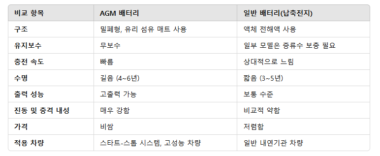 AGM 배터리는 빠른 충전, 높은 내구성, 뛰어난 전력 공급 능력을 갖춘 배터리로, 스타트-스톱 시스템이 적용된 차량이나 전력 소모가 많은 차량에 적합해요. 다만, 일반 배터리보다 가격이 비싸고, 차량에 따라 추가 설정이 필요할 수도 있어요.
