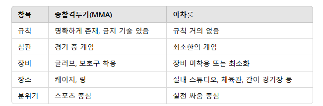MMA는 철저한 스포츠 룰을 따르며, 체계적인 훈련과 심판, 의료진 등이 필수예요. 반면 야차룰은 그러한 시스템을 벗어나 싸움 자체의 본능에 집중한 포맷이에요.