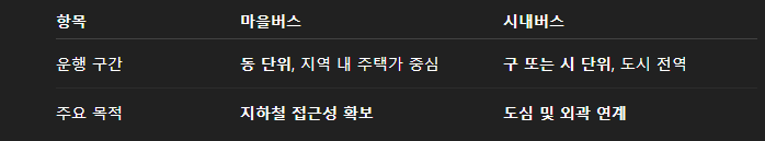 마을버스는 ‘생활밀착형’, 시내버스는 ‘간선교통망’ 중심으로 구조가 나뉘어요.