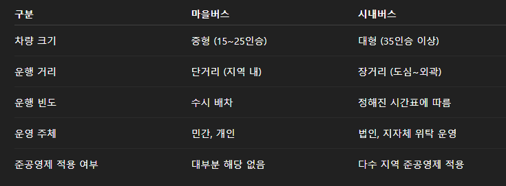마을버스는 개인 또는 소규모 민간업체가 운영하는 경우가 많고, 주로 단거리·생활밀착 노선을 담당해요. 반면 시내버스는 지자체나 대형 법인 회사가 운영하며, 도심과 외곽을 연결하는 주요 간선 노선이 많아요.