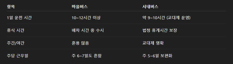 마을버스는 운전 기사 수 부족과 교대 인원 미확보로 인해 한 명이 하루 종일 운전하는 일이 많고, 이는 체력적으로 매우 부담스러울 수 있어요.