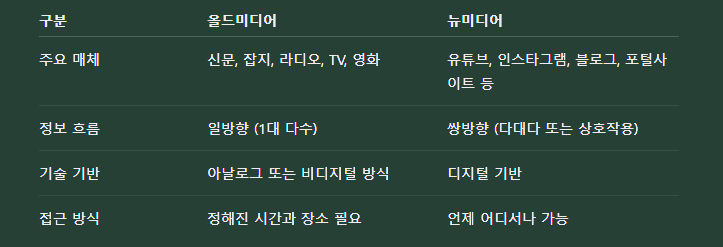 올드미디어와 뉴미디어의 가장 큰 차이점은 디지털 기술의 사용 여부예요. 뉴미디어는 인터넷, 모바일, 소셜미디어, 스트리밍 서비스 등을 통해 쌍방향 커뮤니케이션이 가능하다는 점에서 기존 미디어와 구분돼요.