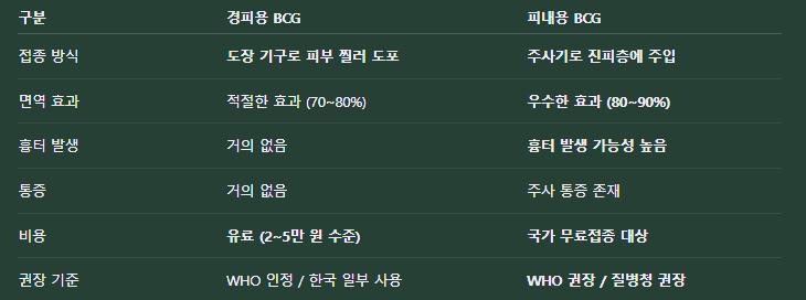 → WHO에 따르면 경피용도 일정 수준 이상의 면역 효과가 있음을 인정하고 있어요. 다만 중증 결핵 예방 효과 면에서는 피내용이 다소 우세하다는 연구도 있어요.