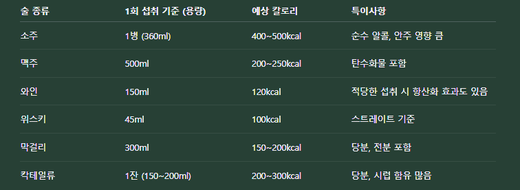 술 종류별 칼로리 비교