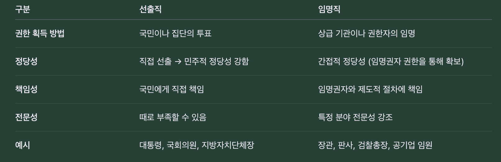 즉, 선출직은 국민의 선택으로 권한을 얻고, 다시 국민에게 책임을 지는 자리예요.