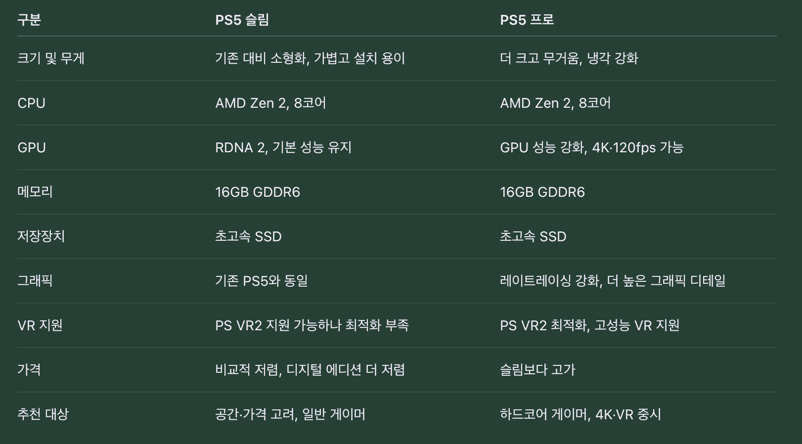 플레이스테이션5 슬림과 프로는 각각의 장점과 목적이 뚜렷한 모델이에요. 슬림은 합리적이고 공간 활용에 강점을 지닌 모델이고, 프로는 성능과 그래픽 품질을 극대화한 모델이에요. 따라서 일반 게이머라면 슬림, 하드코어 게이머나 VR·4K 환경에 투자하려는 분이라면 프로를 추천해요.