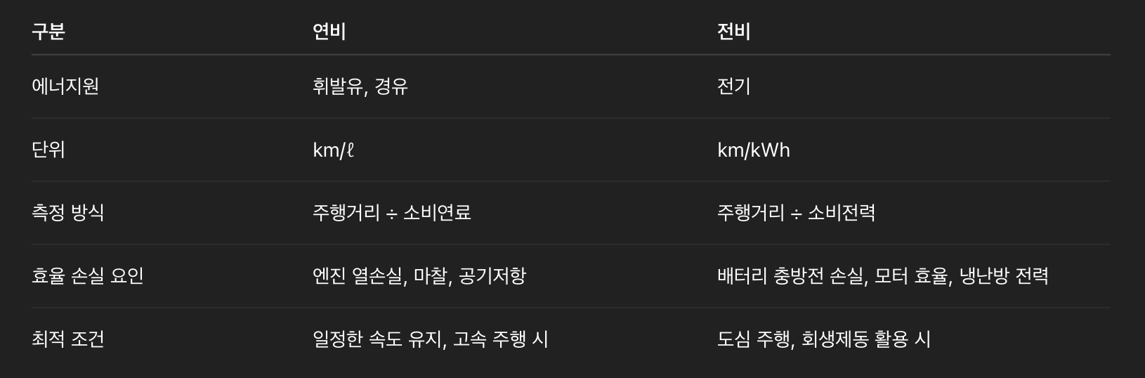 연비와 전비는 모두 ‘에너지 효율’을 표현하는 지표지만,